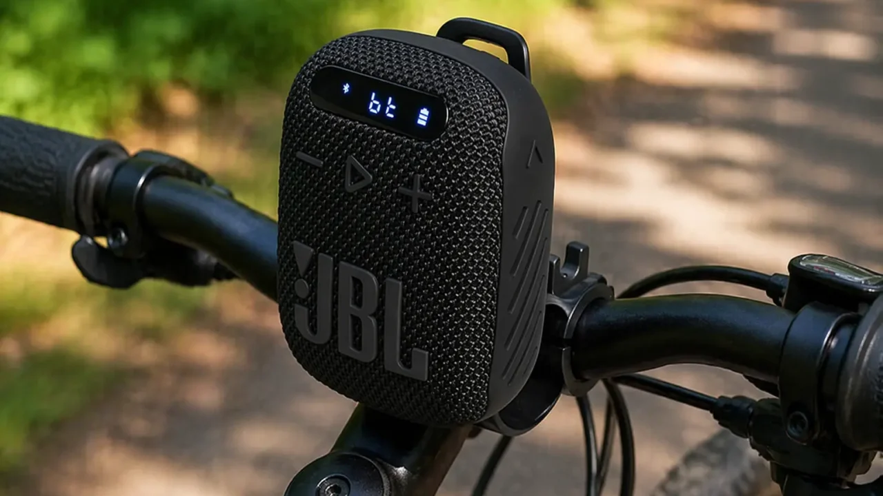 Já a JBL Wind 3 para guidão descreve claramente o suporte de ancoragem e o encaixe no suporte de montagem incluído. Isso muda o perfil de uso, porque o produto fica mais diretamente associado a guidão, deslocamento e alternância entre diferentes fontes de reprodução.